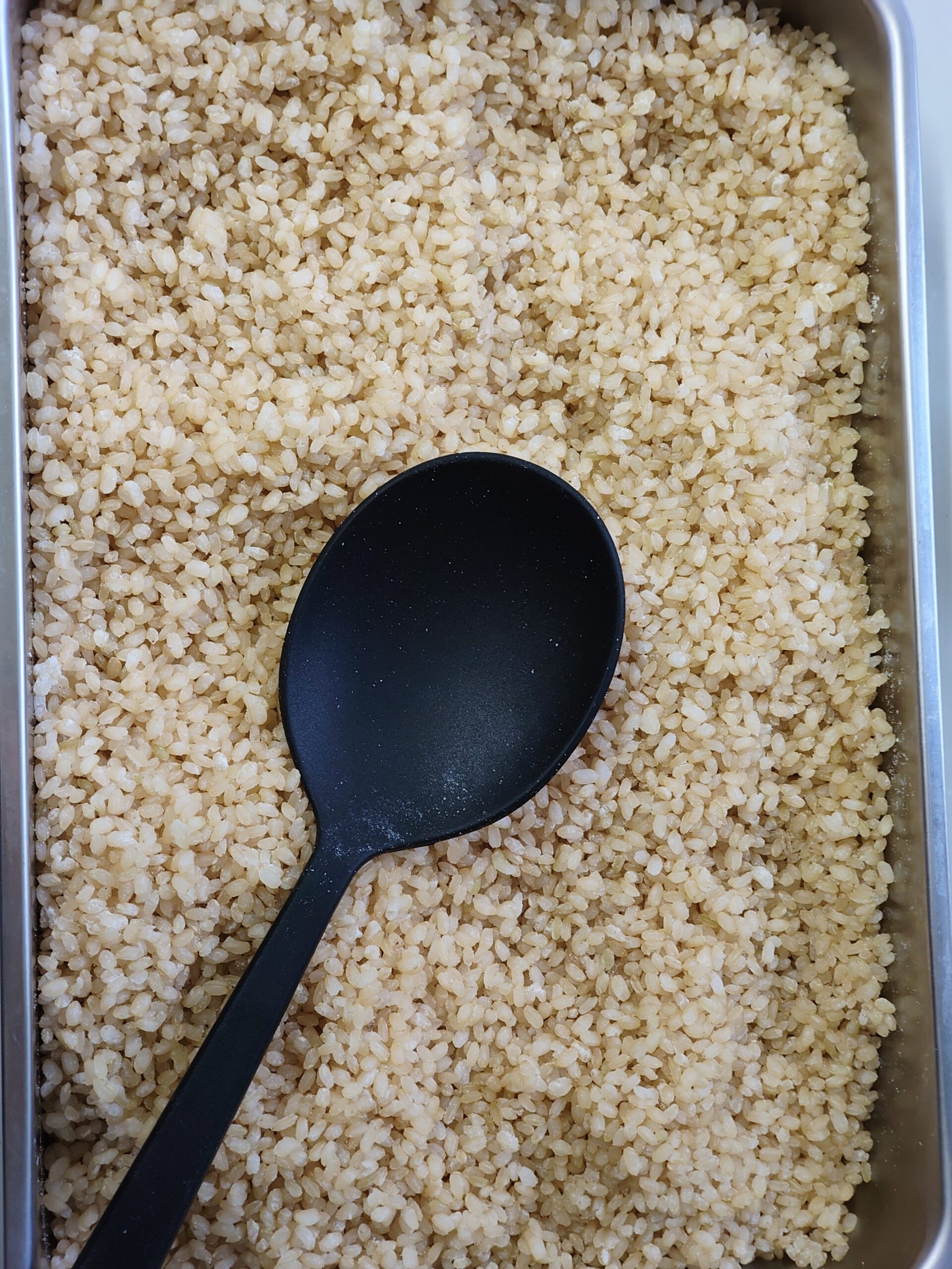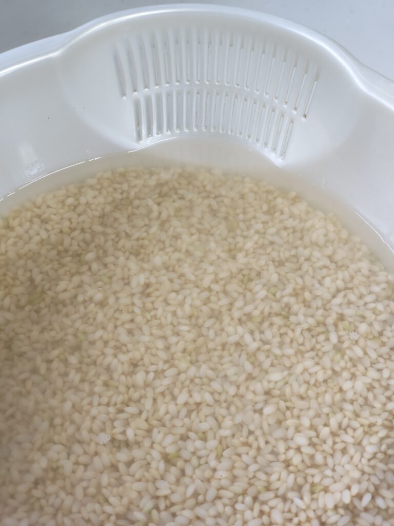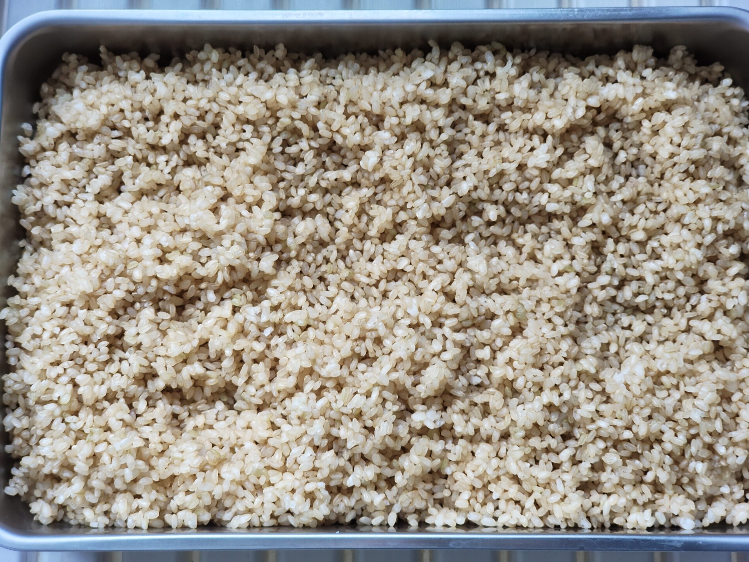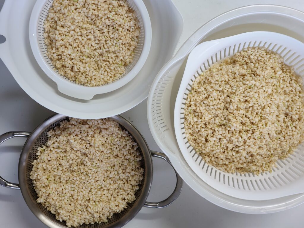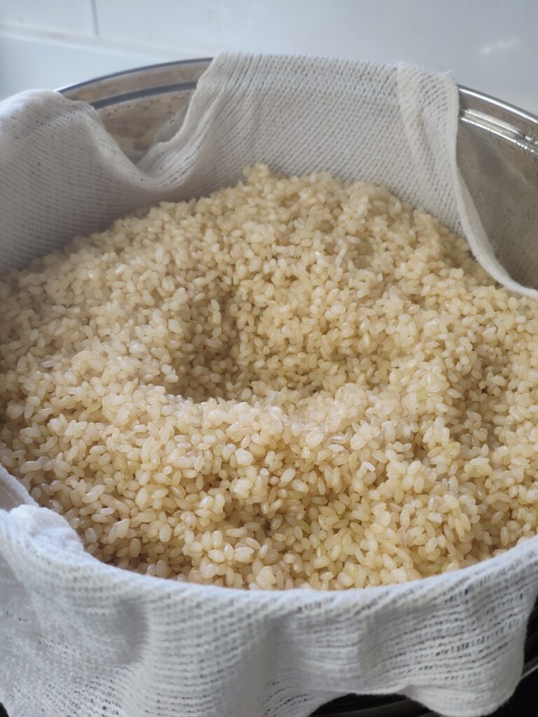 正直、浸ける時間の正解は分からない。白米麹の時は10時間と教わった。玄米の場合、もっと長いほうがいい気がする。と思いつつ、やってしまいます。お米が水を吸うので、水は多めがいいです。