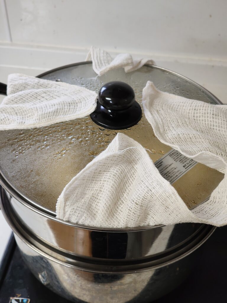 蒸し器に布を入れ、水を沸騰させる。(こうすることで蒸し布を消毒する)