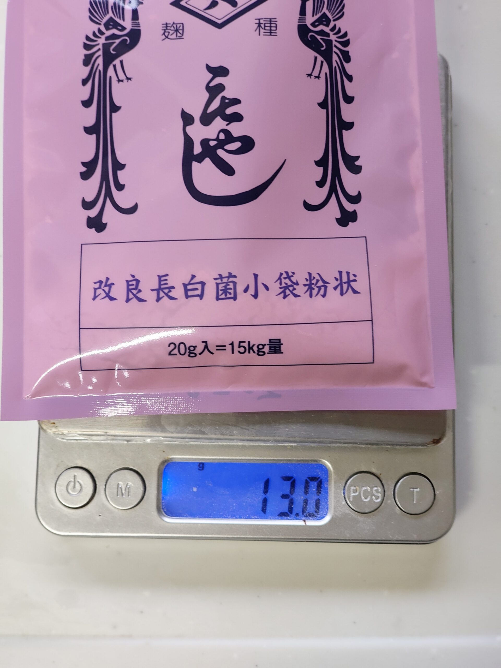 種麹の袋を開けてから計る→まぶして計る、と種麹の重さが計れる。